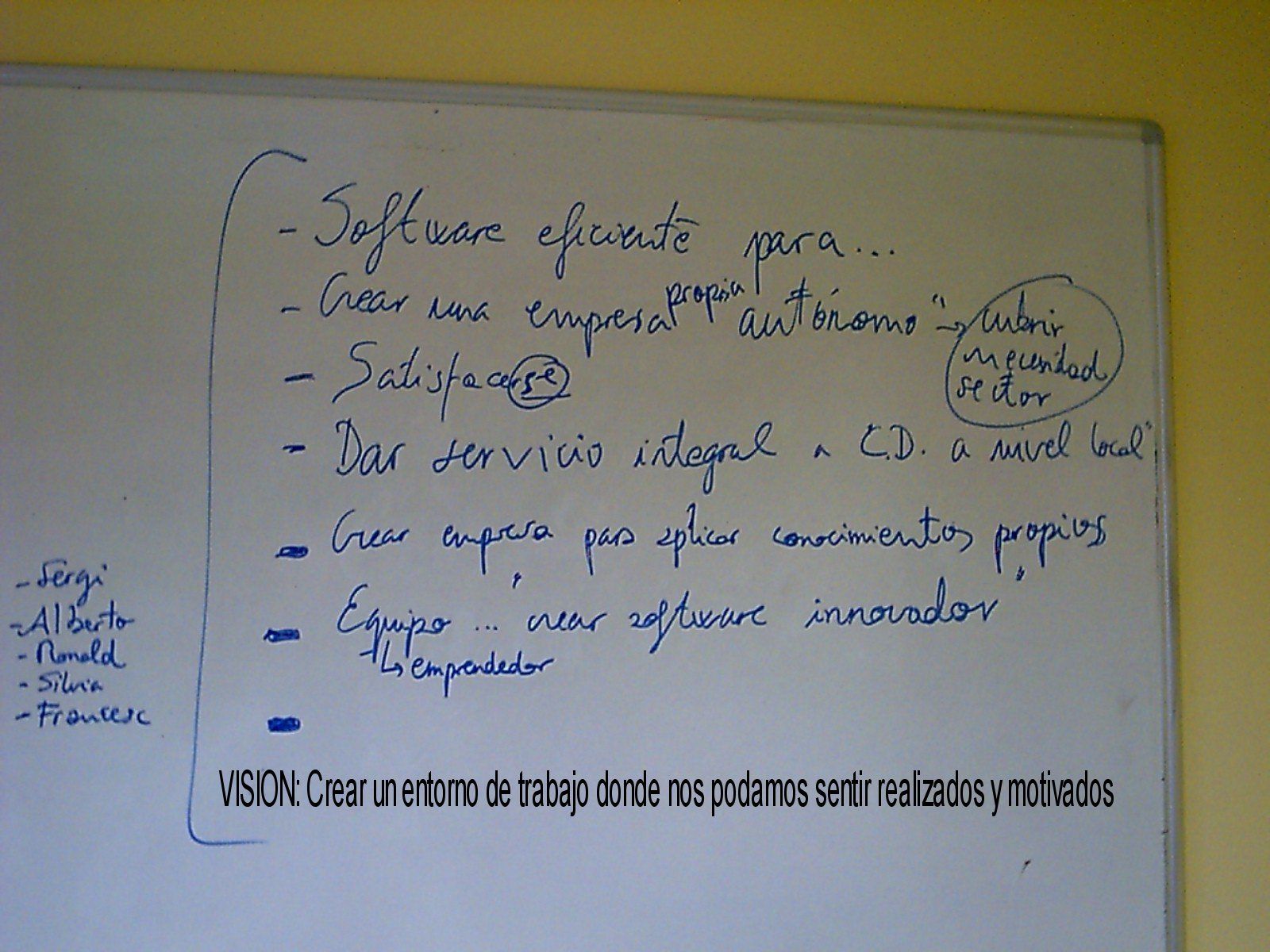 Después la reflexión personal inicial, decidimos realizar un braimstorming con el equipo directivo. Intentamos ver si todos juntos, conseguíamos sacar en claro una visión de empresa que pareciera más enfocada a realidades, más clásica. Obtuvimos, a modo de ejemplo, estos puntos como resultado: